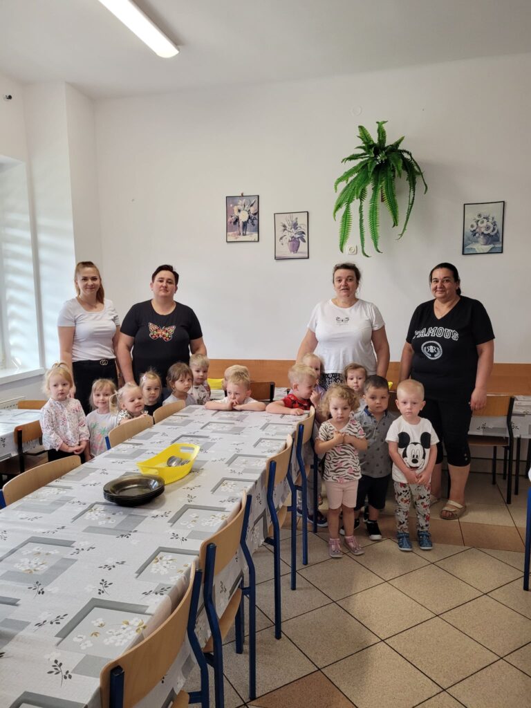 Najmłodsza grupa „Motylki” z zapałem przygotowywała sałatkę owocową w swojej sali. Dzieci z radością kroiły, mieszały i układały owoce, tworząc prawdziwie witaminowe dzieło. Przyrządzanie sałatki sprawiło maluszkom wiele radości, a wspólna degustacja była pyszna i pełna uśmiechów.
