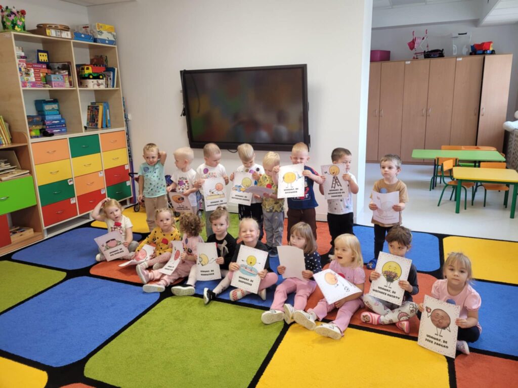 Przedszkolaki z ogromną dumą pozowały do zdjęć, trzymając w rączkach swoje wyróżnienia, a ich uśmiechy udzielały się wszystkim opiekunom. Dzień był pełen niespodzianek, wspólne gry z chustą animacyjną i gumą animacyjną sprawiły, że sala rozbrzmiewała śmiechem i okrzykami. Motylki z entuzjazmem śpiewały wiele piosenek, nie zabrakło też prac plastycznych – stworzyły piękne, kolorowe dzieła.