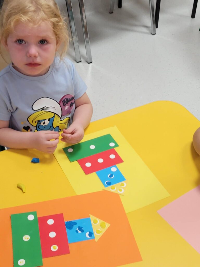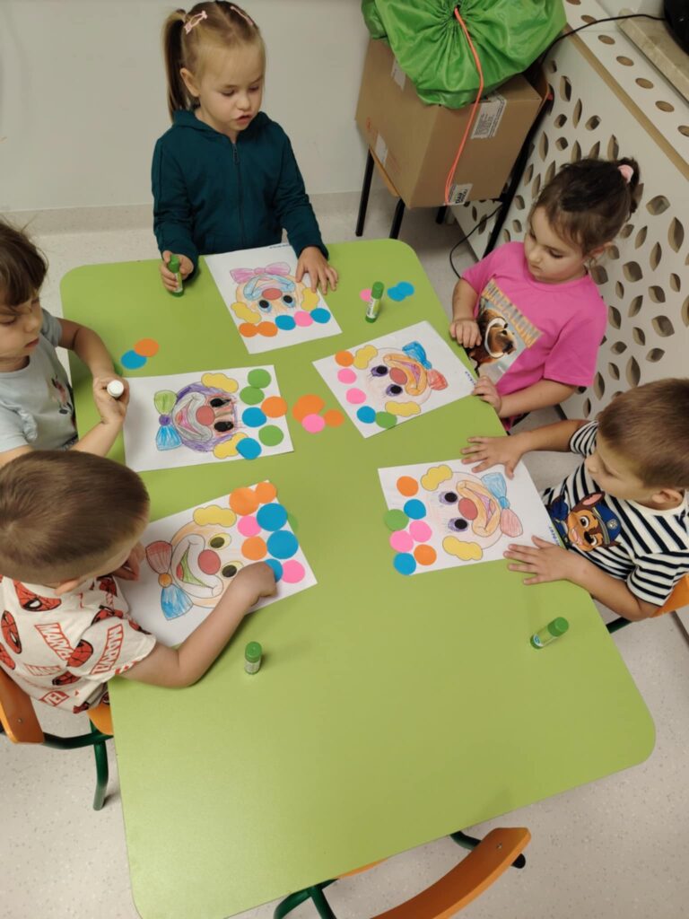 Tego dnia w sali królowały barwne kropki – dzieci przyszły ubrane w ubranka ozdobione tym motywem i z radością uczestniczyły w różnorodnych zabawach. Razem odkrywaliśmy, że kropki spotykamy wszędzie – w przyrodzie, na naszym ciele, a nawet w świecie zwierząt.