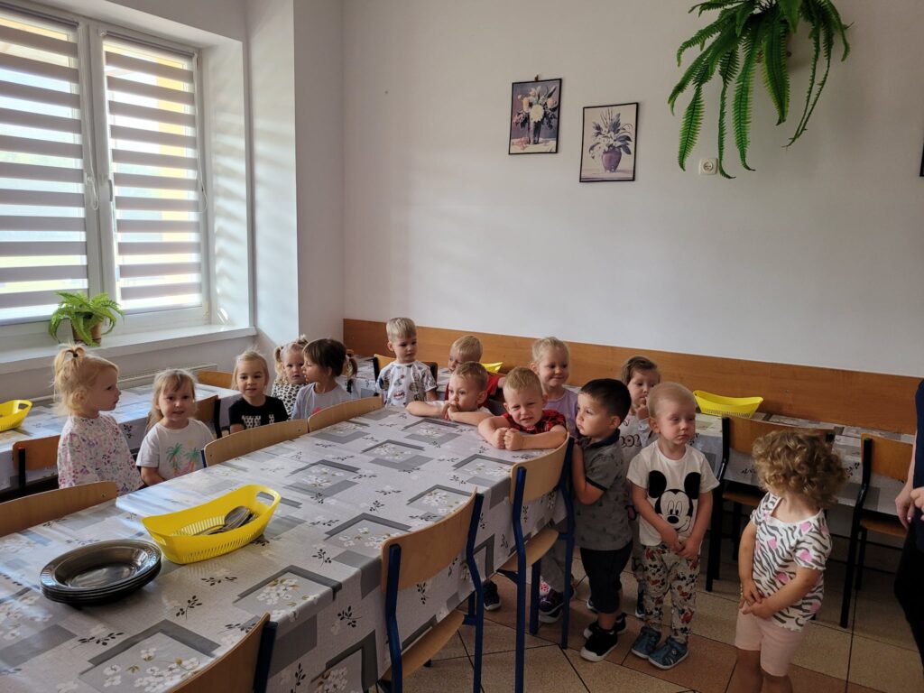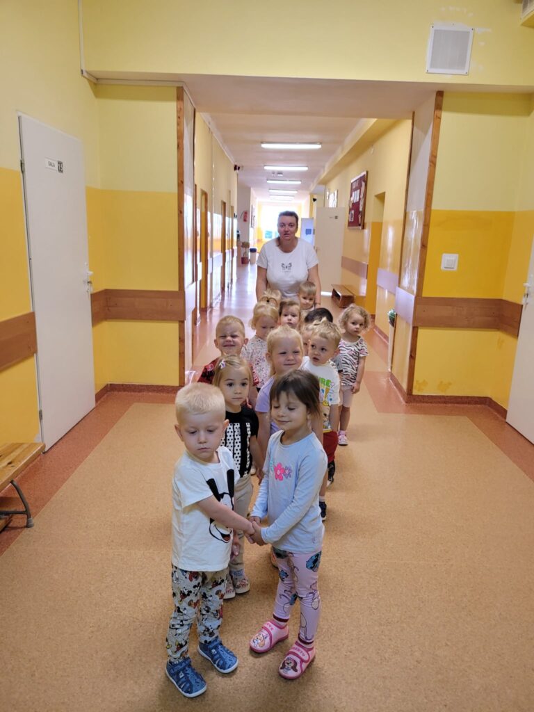 Nasza najmłodsza grupa przedszkolna – „Motylki” wybrała się na wyjątkową wycieczkę po budynku szkoły. Dzieci z zainteresowaniem oglądały korytarz górny i dolny, podziwiając sale oraz kolorowe dekoracje. Maluszki odwiedziły także stołówkę, gdzie każdego dnia pachnie pysznymi posiłkami. Najważniejszym punktem wycieczki było spotkanie z Panią Dyrektor w jej gabinecie oraz wizyta w sekretariacie, gdzie dzieci zostały serdecznie przyjęte. Dzięki tej wyprawie przedszkolaki mogły lepiej poznać szkolne zakamarki i poczuć się jak prawdziwi uczniowie. Starsze dzieci czyli „Sówki” znają już naszą szkołę, dlatego udały się na spacer po okolicy.