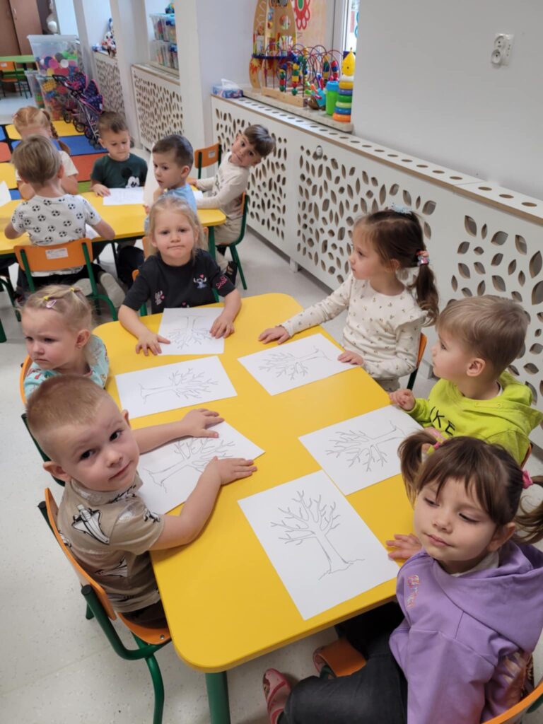 Przyznam, że nasze przedszkolaki mają sporą wiedzę na temat drzew, gdyż z zapałem odpowiadały na wszystkie pytania zdawane przez naszego gościa. Następnie „Motylki” i „Sówki” zasiadły do pracy plastycznej. Ich zadaniem było ozdobienie suchymi listkami rysunku konturowego drzewa. Prace wyszły fantastycznie. Nie obyło się też bez nagród. Każde dziecko otrzymało naklejkę i tytuł Strażnika Przyrody.