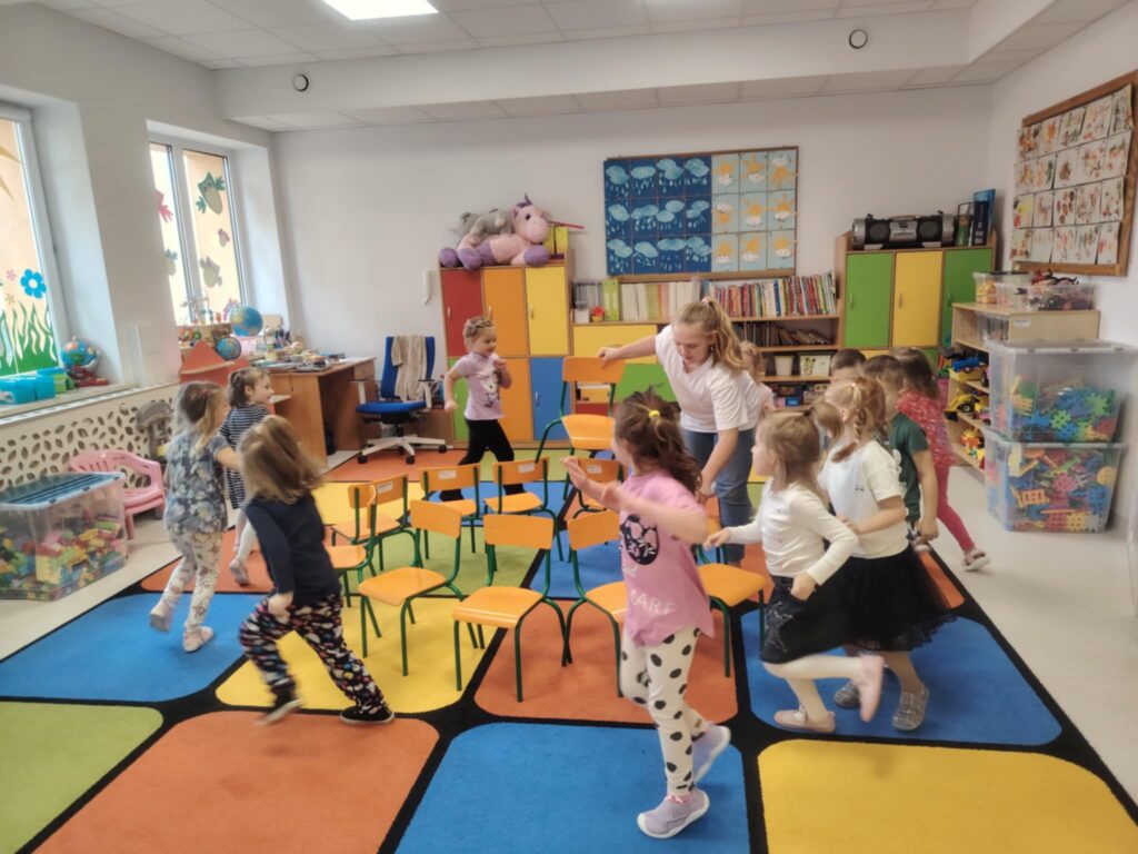 Wypoczęte po weekendzie dzieci miały mnóstwo sił i energii do tańca i zabaw ruchowych.