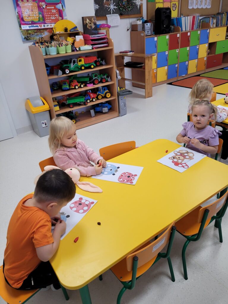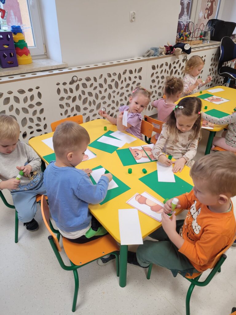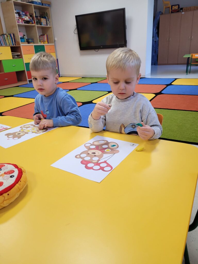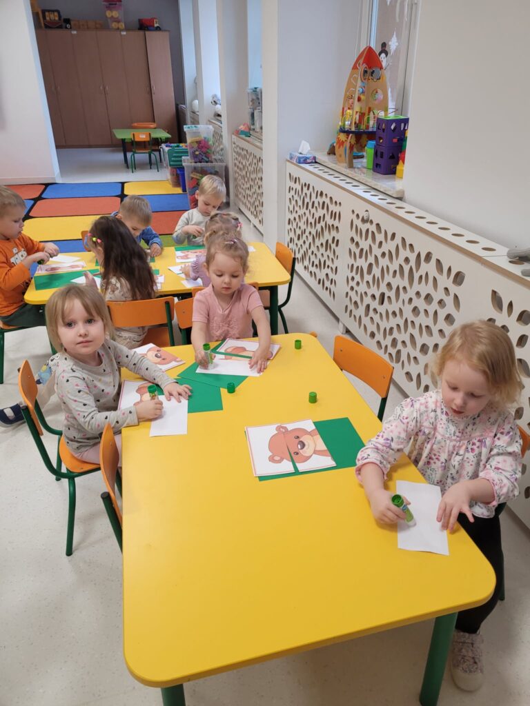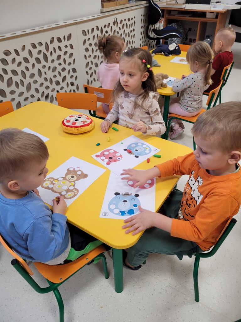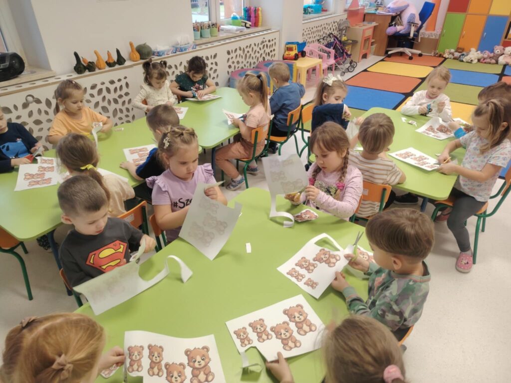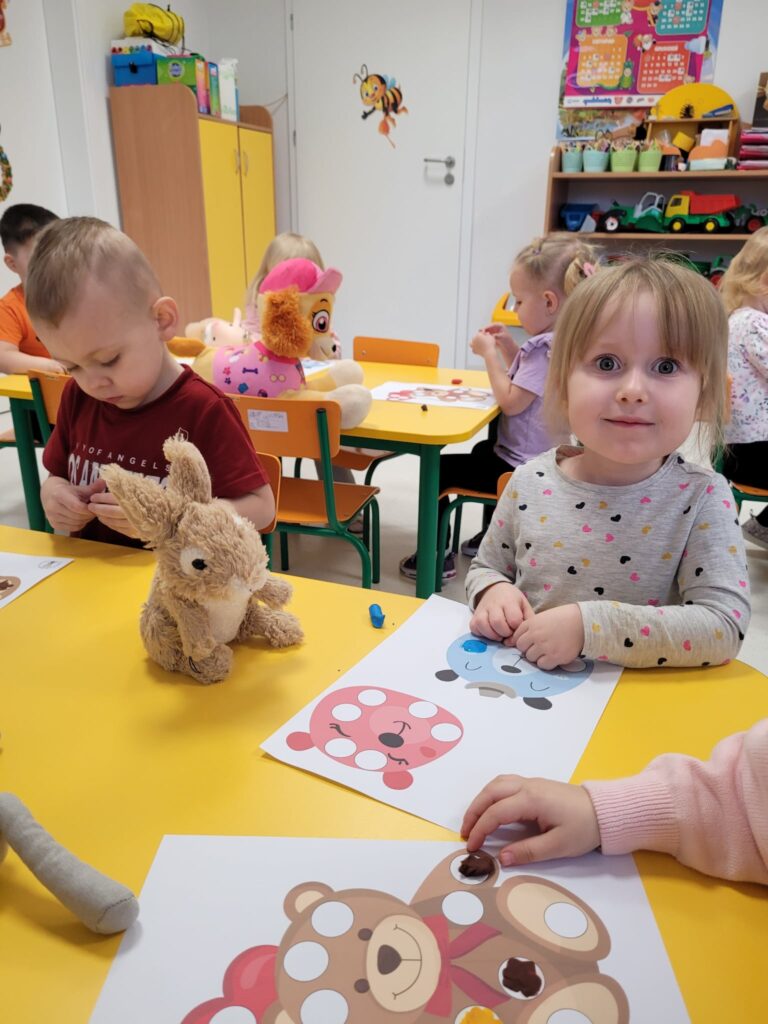 Kolejnym punktem dnia były działania plastyczne. Dzieci otrzymały karty pracy z obrazkami misiów, które wyklejały plasteliną według własnych pomysłów. Powstały kolorowe, oryginalne kompozycje, w których można było dostrzec ogromną kreatywność „Motylków”. Następnie przedszkolaki układały trzyelementowe papierowe puzzle i prawidłowo przyklejały je na kartonie, ćwicząc spostrzegawczość, dokładność i logiczne myślenie. Chętnie kolorowały również misiowe ilustracje, nadając im barw pełnych dziecięcej fantazji.