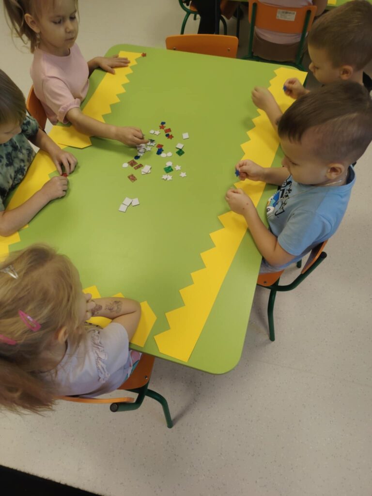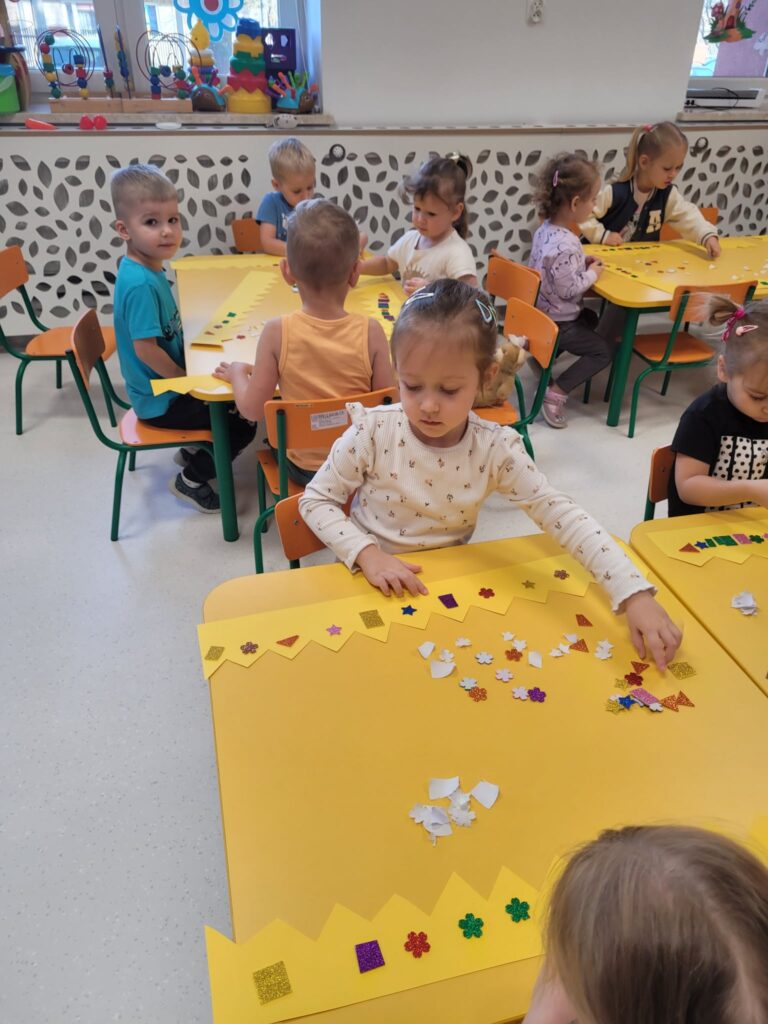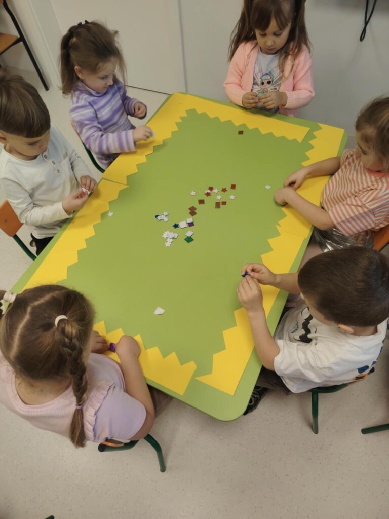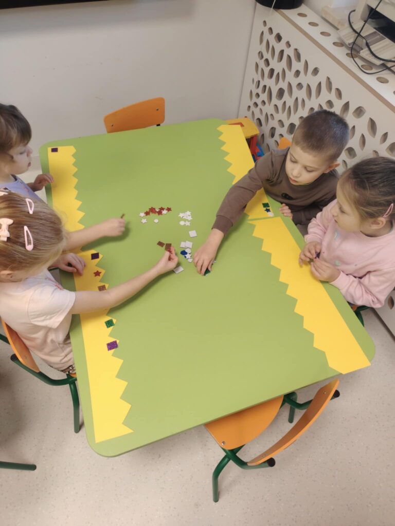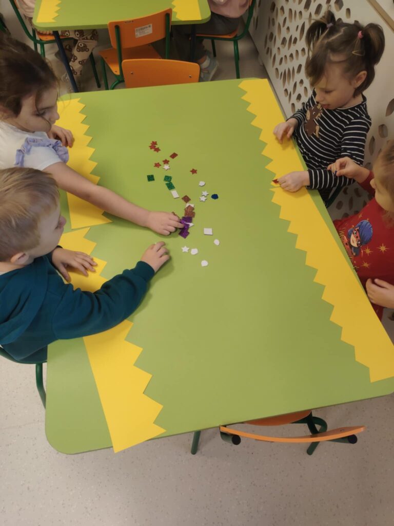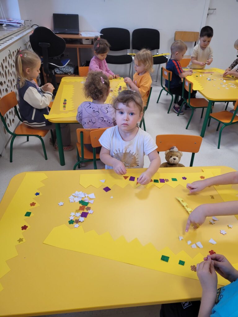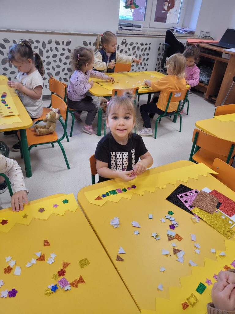Kolejnym punktem dnia były działania plastyczne. Dzieci otrzymały karty pracy z obrazkami misiów, które wyklejały plasteliną według własnych pomysłów. Powstały kolorowe, oryginalne kompozycje, w których można było dostrzec ogromną kreatywność „Motylków”. Następnie przedszkolaki układały trzyelementowe papierowe puzzle i prawidłowo przyklejały je na kartonie, ćwicząc spostrzegawczość, dokładność i logiczne myślenie. Chętnie kolorowały również misiowe ilustracje, nadając im barw pełnych dziecięcej fantazji.