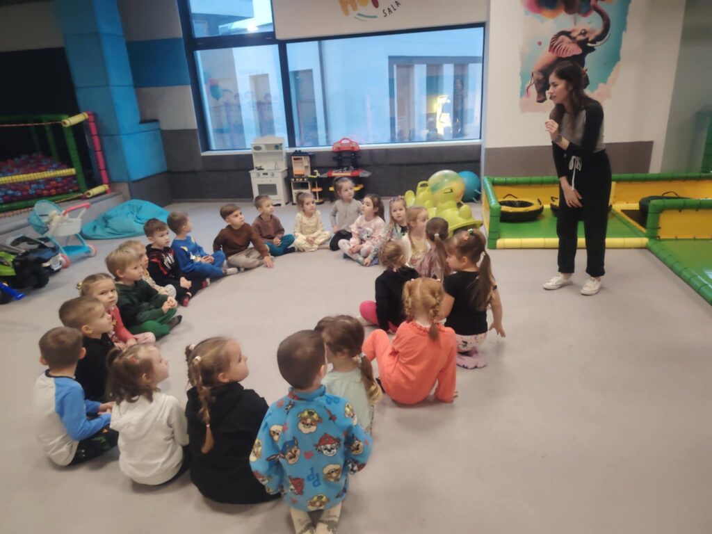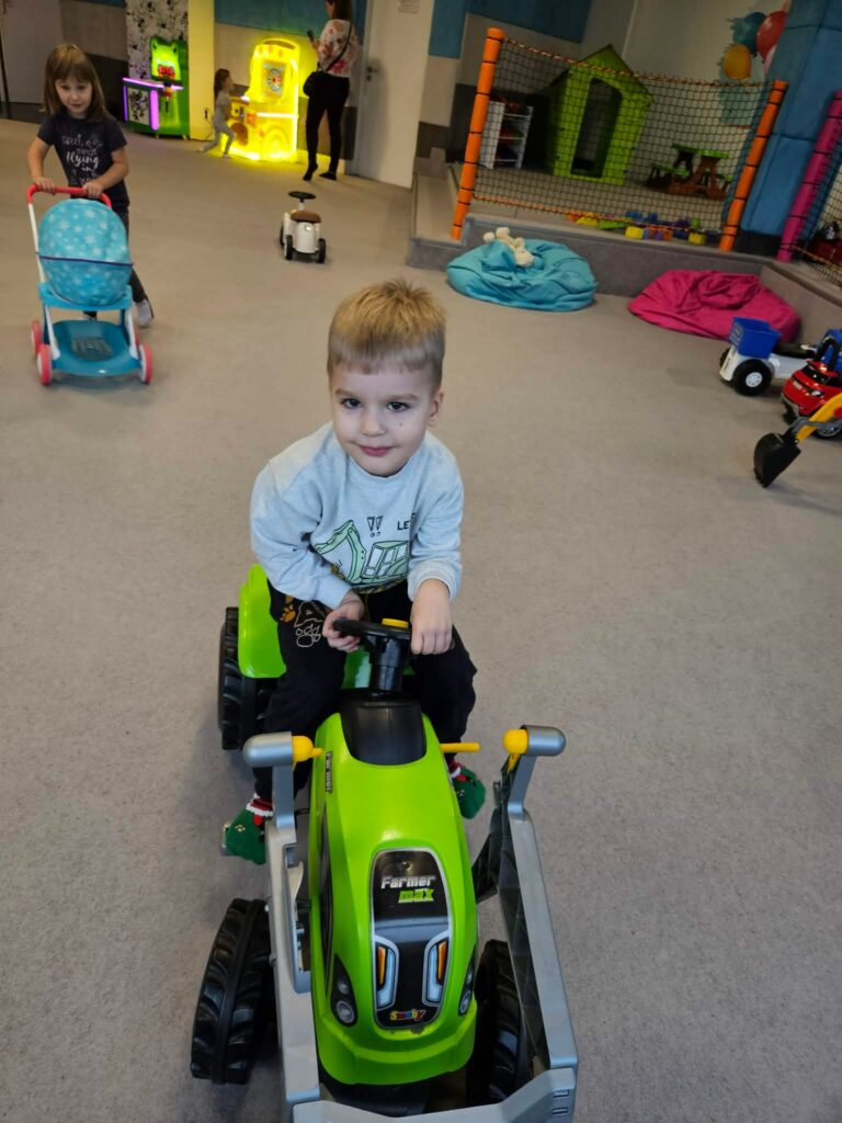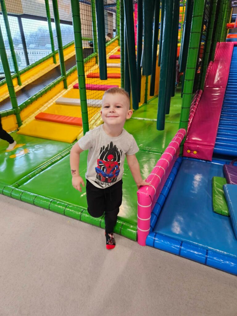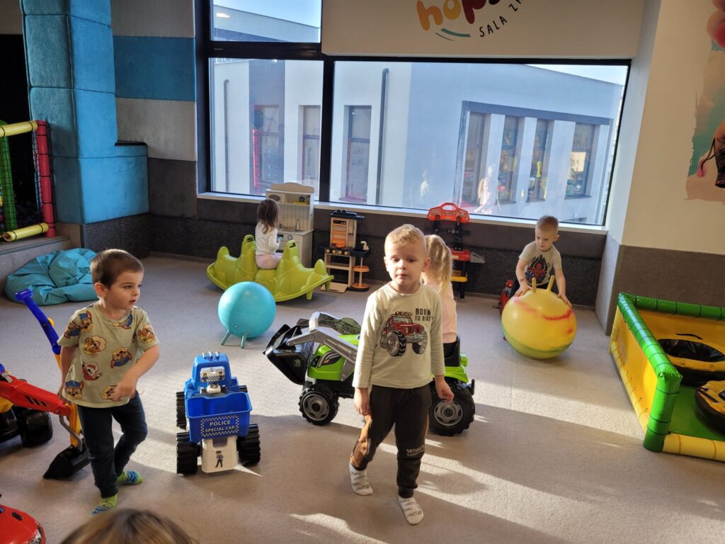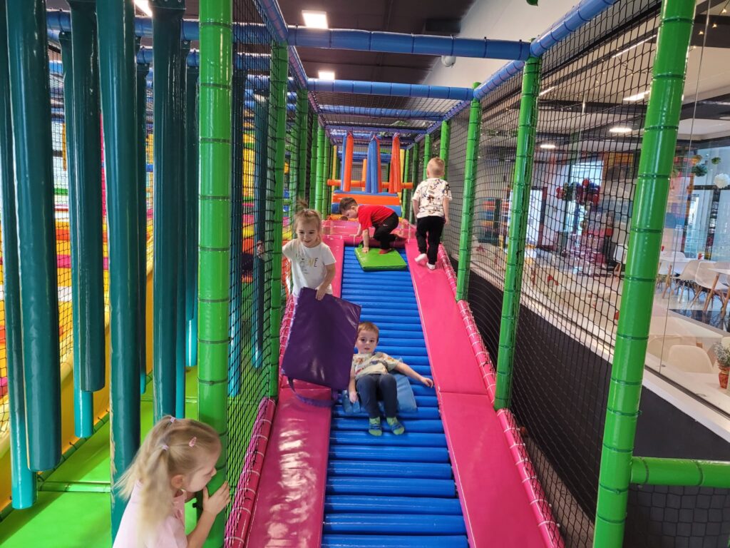 Po dotarciu na miejsce dzieciom zostały przypomniane zasady bezpiecznego korzystania z atrakcji. Następnie przedszkolaki weszły do głównej sali zabaw. Dzieci z radością korzystały z dostępnych atrakcji – biegały, skakały, zjeżdżały na zjeżdżalniach i pontonach, wspinały się po konstrukcjach, jeździły samochodzikami oraz bawiły się w basenie wypełnionym kolorowymi piłkami.