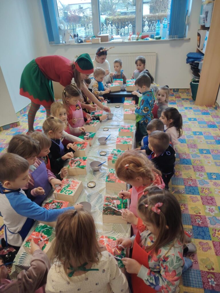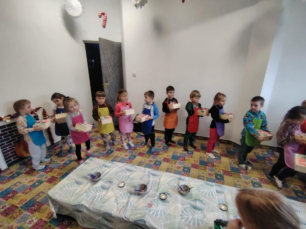 12 grudnia dzieci z naszej zerówki uczestniczyły w warsztatach świątecznych połączonych z odwiedzinami Świętego Mikołaja. Zajęcia rozpoczęły się od napisania listu do Świętego Mikołaja oraz wrzucenia do skrzyneczki. Następnie dzieci lukrowały i dekorowały pierniczki, które szybko rozpłynęły się nam w ustach. Kolejnym punktem tego wyjątkowego dnia były odwiedziny Świętego Mikołaja, który wręczył przygotowane przez Rodziców upominki. Dzieci zaskoczyły Mikołaja wspólnie przygotowaną piosenką oraz obdarowały laurkami. Następnie przedszkolaki zamienili się w prawdziwych artystów ślicznie ozdabiając drewniane bombki. Wszyscy pracowali z ogromnym zapałem. Dzieci z dumą zabrały dekorację do domu, aby stały się ozdobą świątecznej choinki. Niestety nasz przemiły starszy Pan musiał nas opuścić, ale został z nami Olaf, gdzie razem tańczyliśmy przy piosenkach. Zorganizowane warsztaty były niezwykle radosnym przeżyciem.