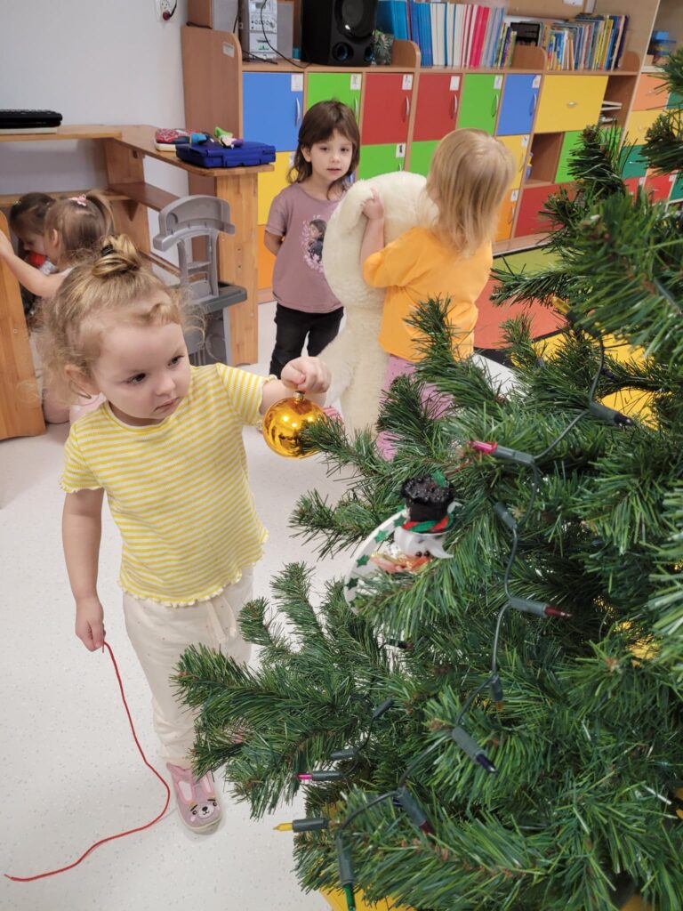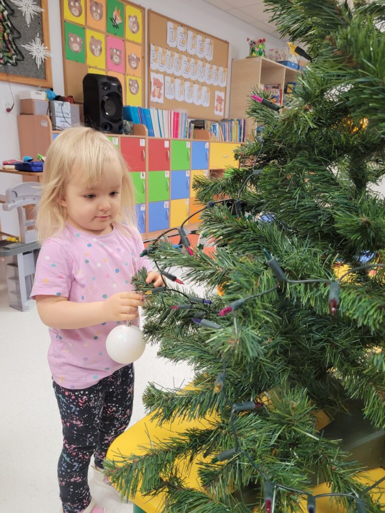 Przedszkolakom bardzo podobało się strojenie bożonarodzeniowego drzewka. Z radością pomagały zawieszać bombki i inne ozdoby.