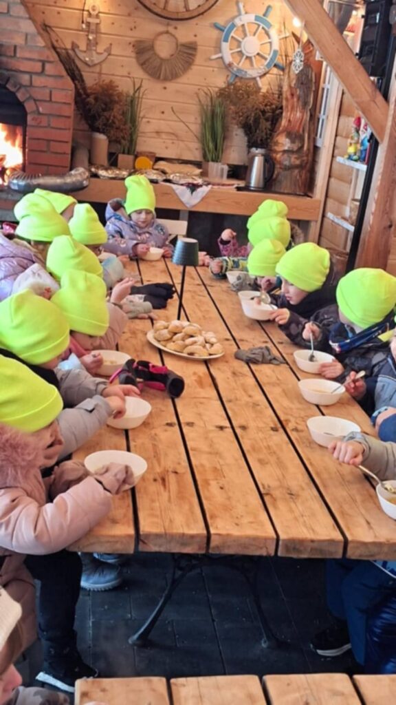 Po powrocie aby się trochę nagrzać zjedliśmy gorący rosół, pizzerinki, rogaliki i wypiliśmy ciepłą herbatę. Każdy mógł znaleźć coś pysznego.