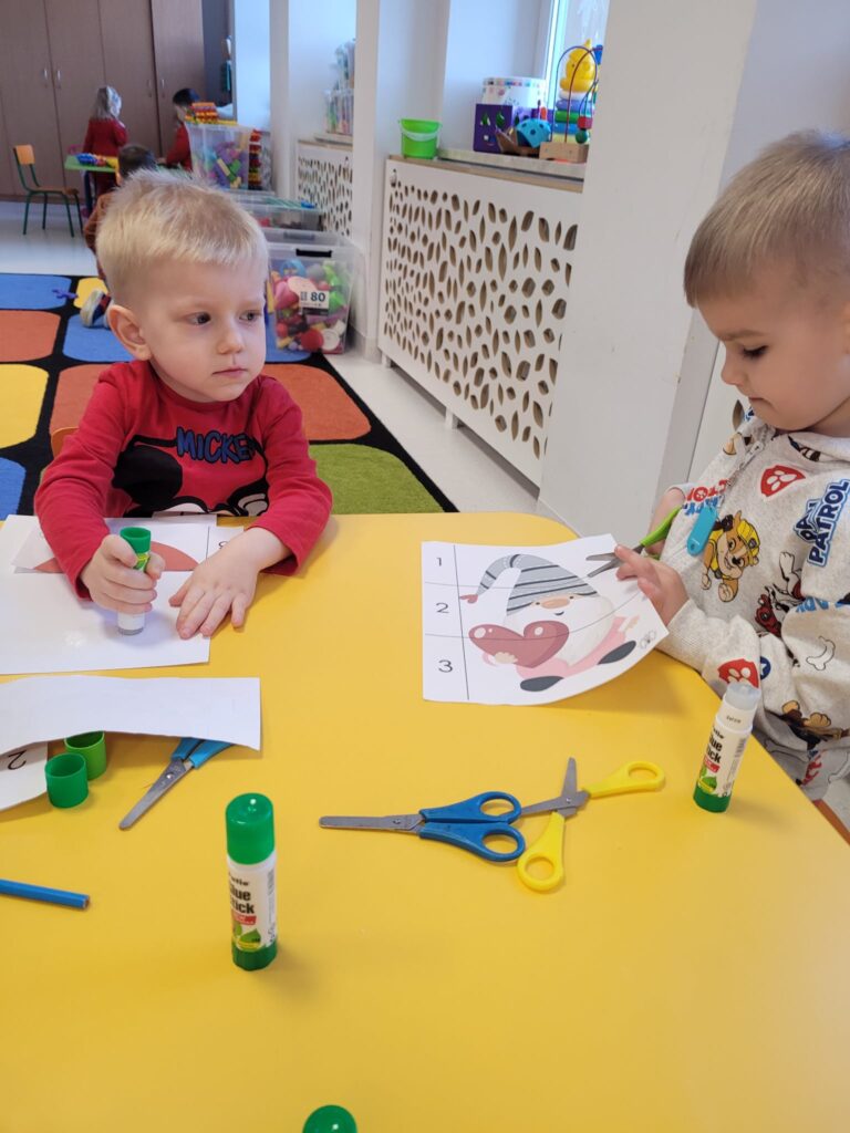 Po śniadaniu ruszyły do wspólnych zajęć ruchowych. Tańczyły z misiami, podrzucały je a na koniec mocno wyprzytulały. Dzieci znają pojęcie „najmniejszy, największy” dlatego bez problemu ustawiły w ten sposób swoje misie a same zasiadły do stolików i zajęły się trudniejszymi zadaniami z nożyczkami.