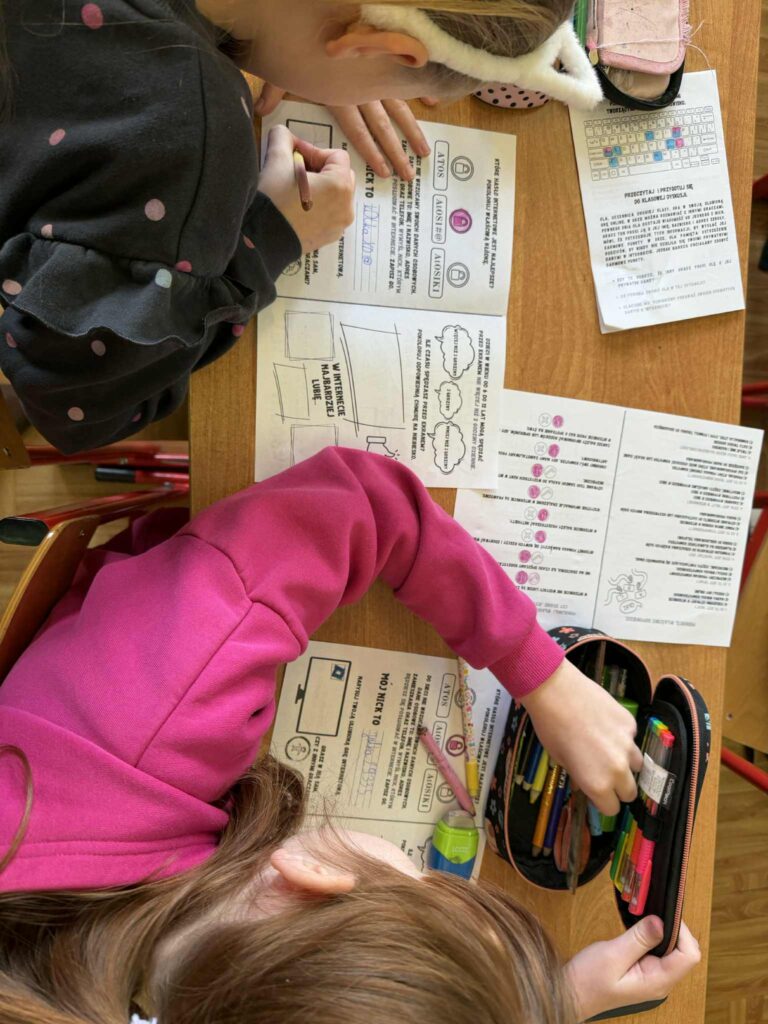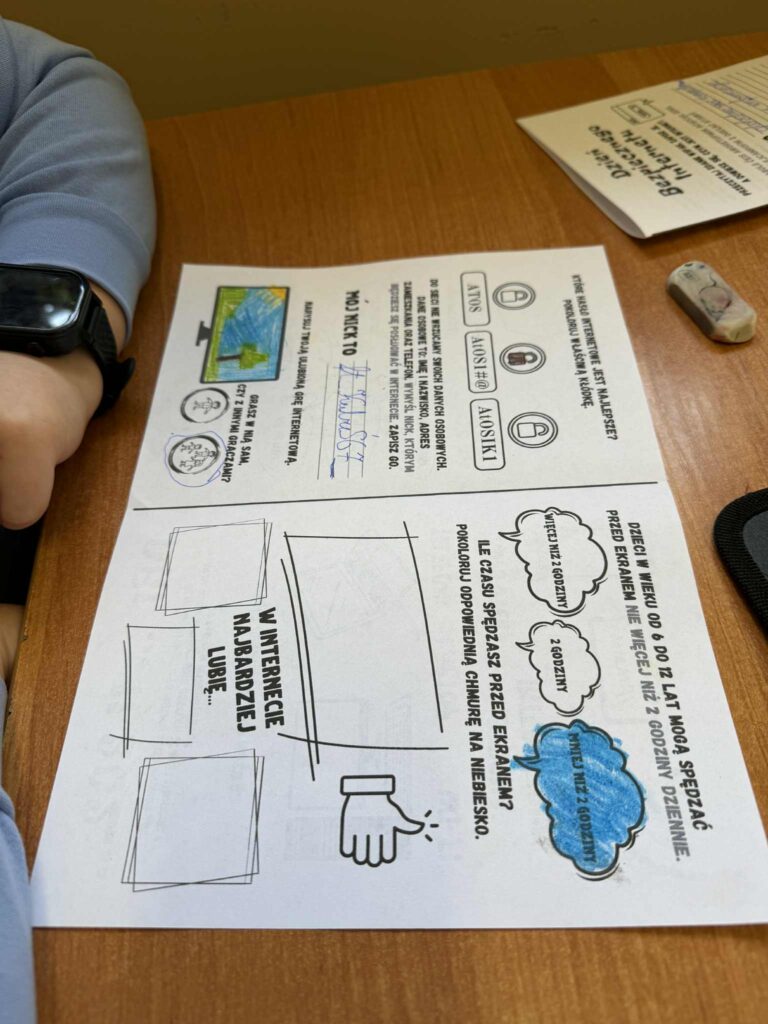 Podczas zajęć dzieci rozmawiały o zasadach bezpiecznego poruszania się w sieci, ochronie danych osobowych oraz właściwym zachowaniu wobec innych użytkowników Internetu. Uczniowie rozwiązywali karty pracy promującą bezpieczne korzystanie z Internetu.