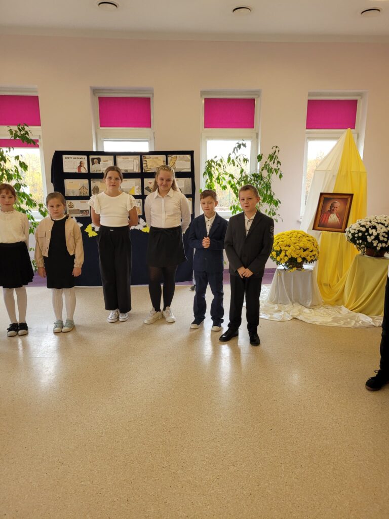 W wydarzeniu uczestniczyli ksiądz proboszcz, Pani Dyrektor, nauczyciele oraz cała społeczność szkolna. Recytacje, pieśni i wspólne chwile refleksji wprowadziły wszystkich w nastrój wdzięczności i głębokiego szacunku dla patrona ludzi młodych. Dzieci, poprzez swoje występy, z niezwykłą szczerością i zaangażowaniem oddały hołd papieżowi, którego nauka wciąż inspiruje do czynienia dobra.