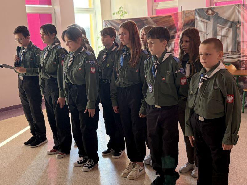 Uroczystość uświetniła również drużyna harcerska, pod opieką Pani Izabeli Chacińskiej, która upamiętniła poległych w walkach o wolność naszej Ojczyzny.