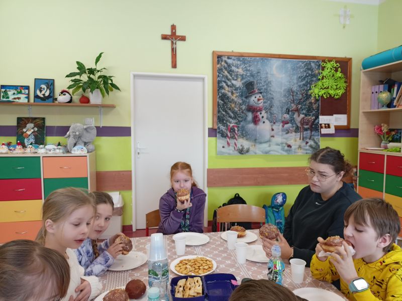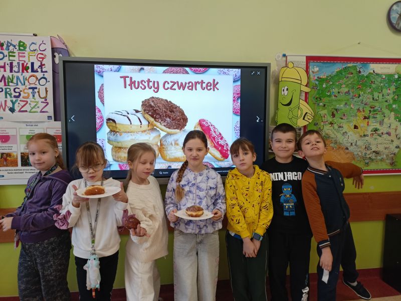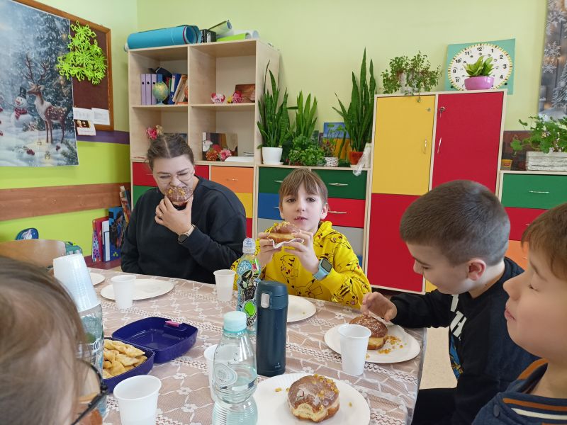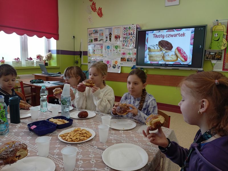 Uczniowie klasy II delektowali się pączkami z konfiturą, lukrem oraz chrustami (faworkami). Wspólne świętowanie tłustego czwartku stało się okazją do rozmów, śmiechu i budowania przyjaznej atmosfery . Pani przypomniała o dawnych zwyczajach, takich jak ukrywanie orzeszka w pączku (symbol dostatku).